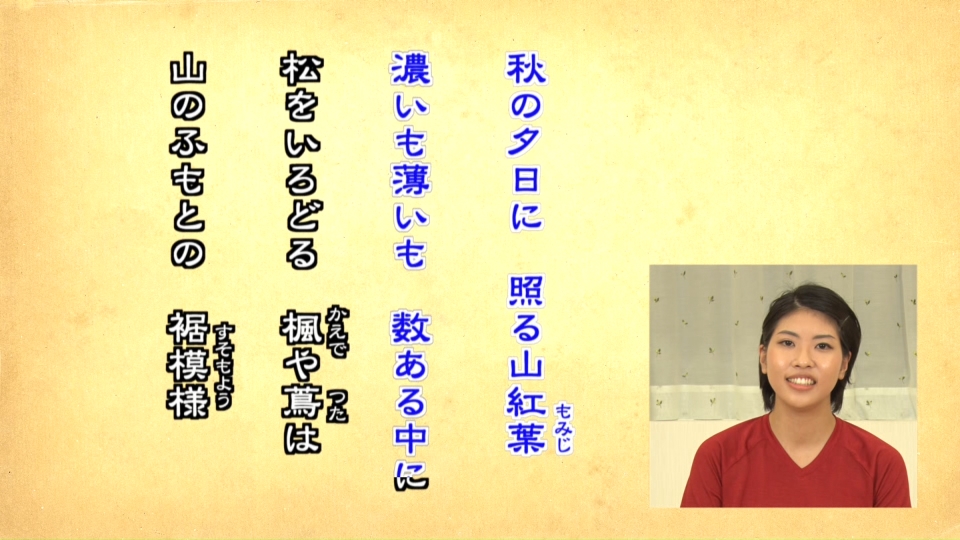 | B | 和歌のリズムに合わせた発声と和歌意味理解 | 和歌のリズムに合わせた発声と和歌意味理解 | 和の雰囲気を感じながら音読 |